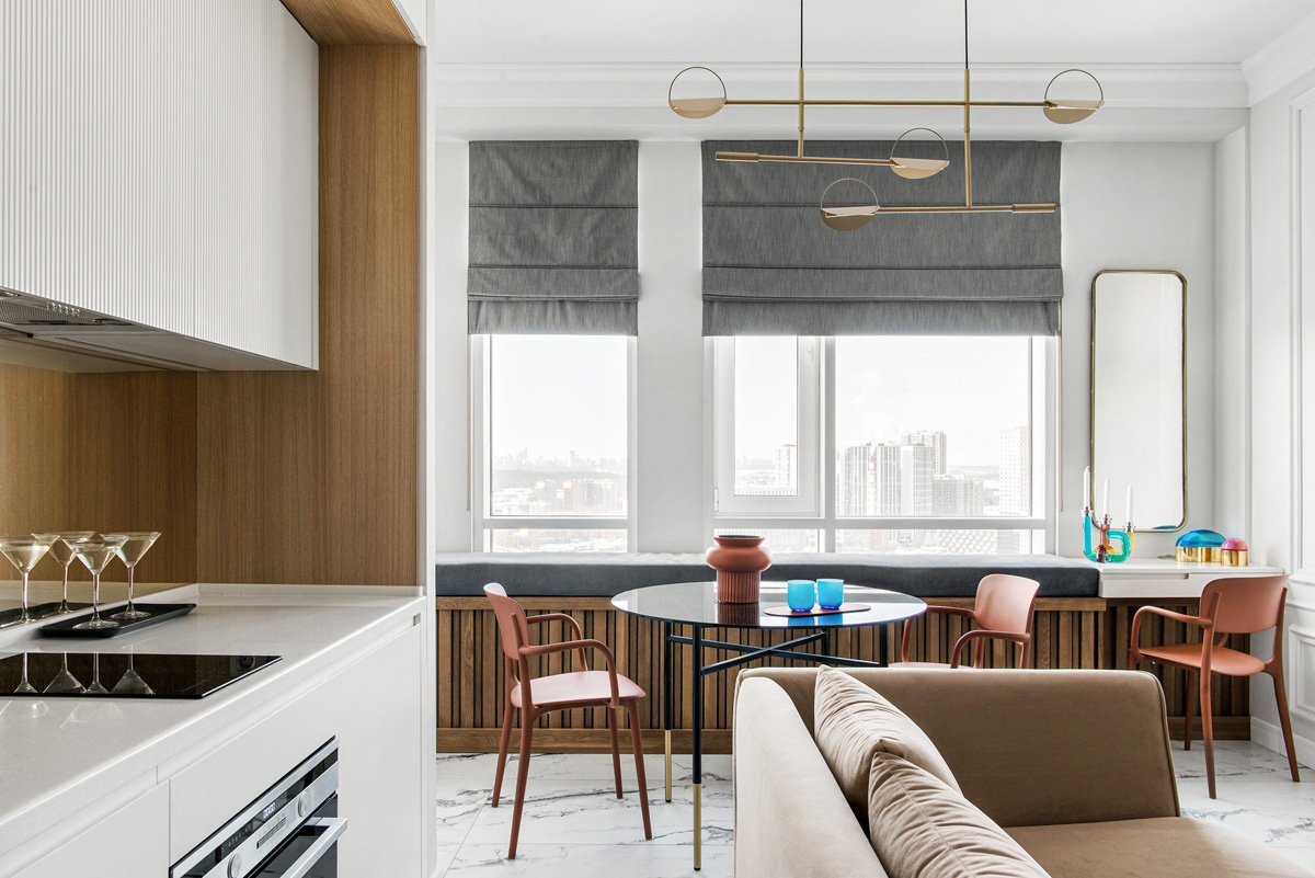 Самое оптимальное распределение зон в квадратной студии! Хорошо, что кровать именно за раздвижными дверьми, а не шторой.