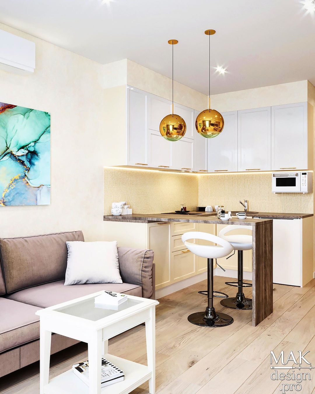 Квартира-студия: дизайн интерьера, общая с лоджией 29, 8 кв.м. Ванной в проекте нет, заказчица решила просто наклеить белый кафель кирпичиком. Без ванной 25,1 кв.м с лоджией. Площадь жилой комнаты 16,4 кв.м